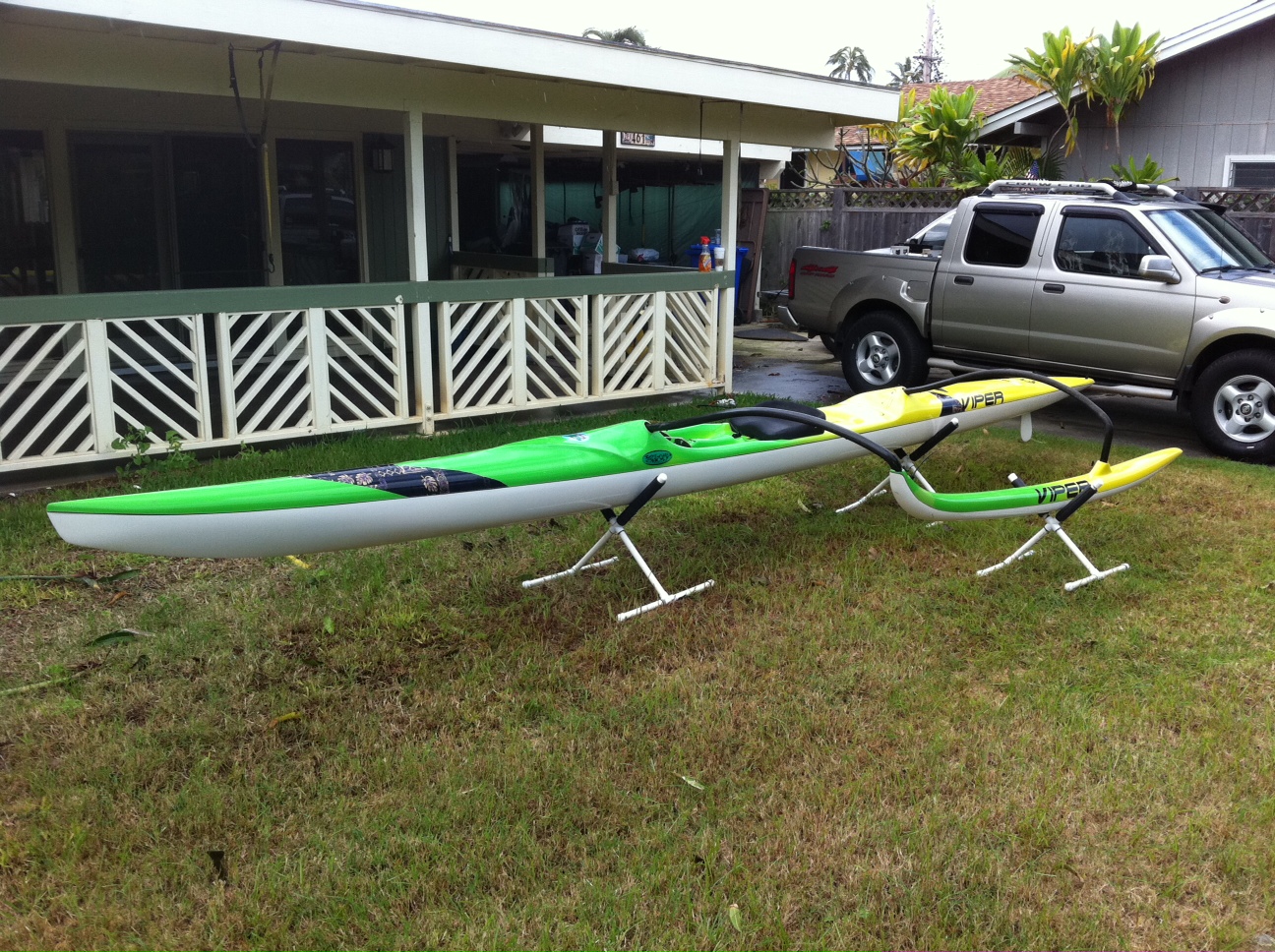 2009 Hurricane OC-1. Is stored with cover, indoors. Orange top/white underside. Custom padded cover (normally $600) for canoe and ama included. Also includes original stock cover for canoe, ama and iakos.
