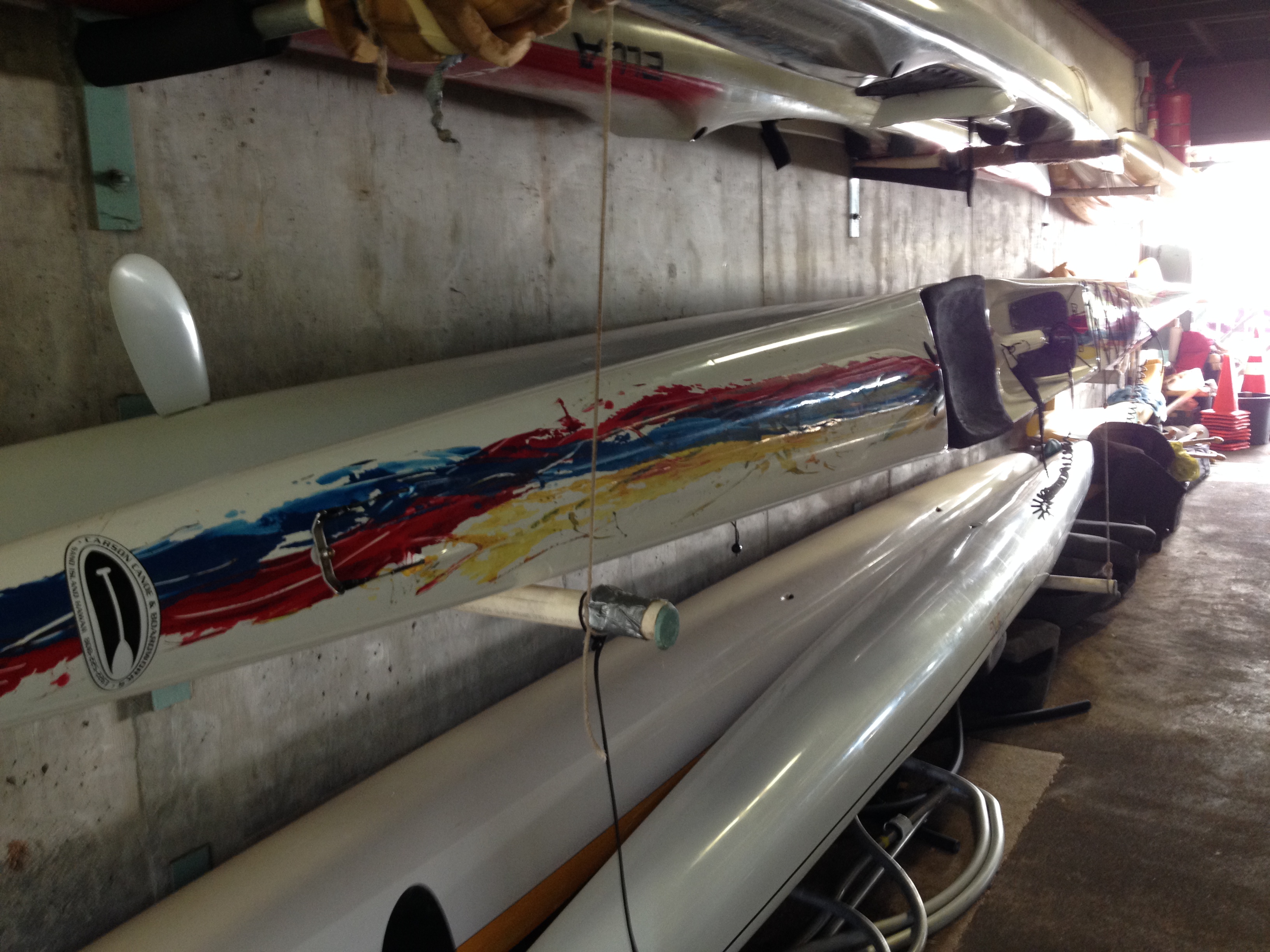 Rudderless One-man. This va'a is cherry! Barely used then stored in the dark for years. (after the iakos broke and disappeared- so those aren't included)