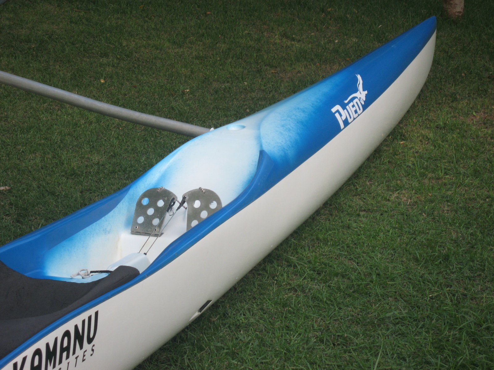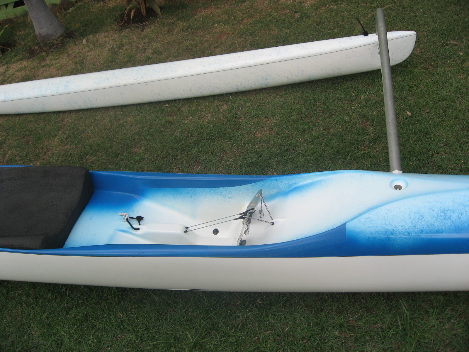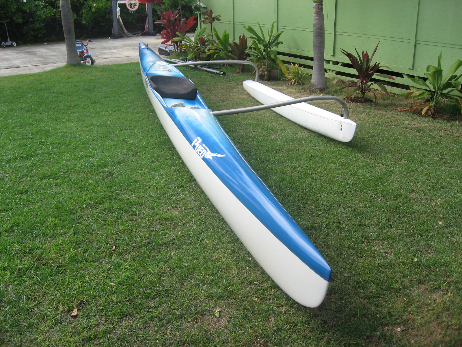 Older Pueo, water tight, good solid boat, minor dings fixed by Bixlar, comes with adjustable seat. Boat is blue fade top.