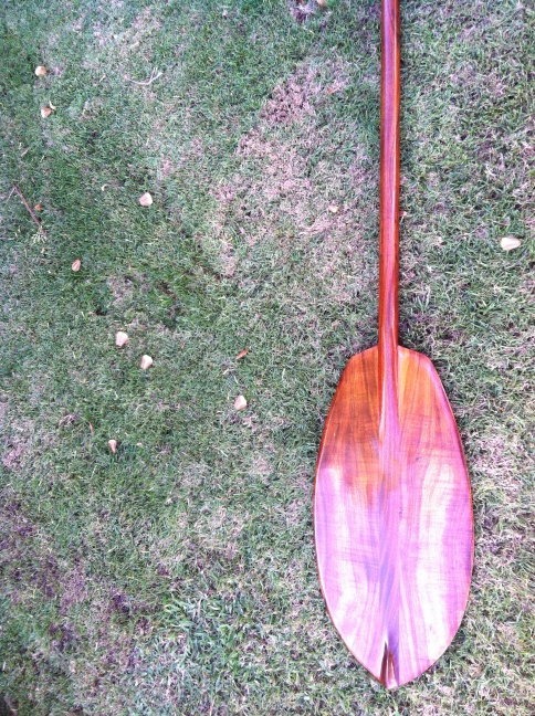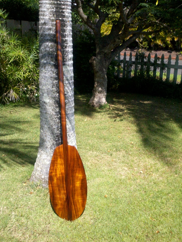 This beautiful handcrafted, ornamental steering blade was designed 100% from Premium Curly Koa Wood. It could be a beautiful display in your home or office or even used to steer an outrigger canoe. The blade is 11.5" wide and 24" tall while the whole paddle measures 5ft tall. Straight shaft, no handle, "peaked tip".