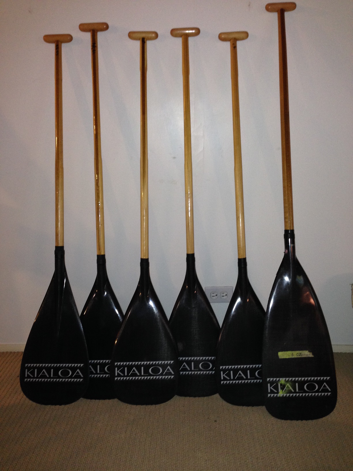 Go fast now! Great Condition; only used for races. various sizes- Nehu 49", Axel II 49" (3), Axel II 50", Biscuit Steering Blade 53". Also available but not shown- Nehu 49" with Hawaiian print blade. These paddles were hand picked at the factory for ultra light weight. Paddles $170 each, Steering blade $175. Just buy the whole set at a discounted price. Regular cost is $250 each. 352-0505
