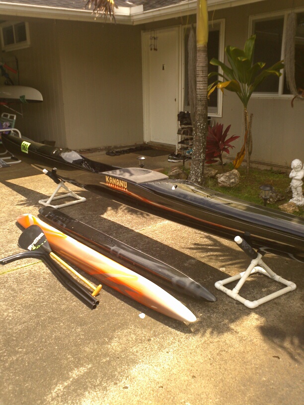 Double carbon black/clear with gold flake glitter 1st gen pueo. Few years old. Common wear and tear. But canoe is water tight. Comes with two amas Original ama with extensive patch repairs but water tight now. And Orange/beige/brown ama (mannys old ama) $3800.