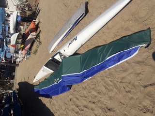 A padded canvas cover for OC1 boat and amma (pueo) made by Hawaiian Canoe Canvas. The green canoe cover is almost brand new and in excellent condition. the grey Ama cover is in very good condition, only a few months use. Both have the same interior padded purple lining.
