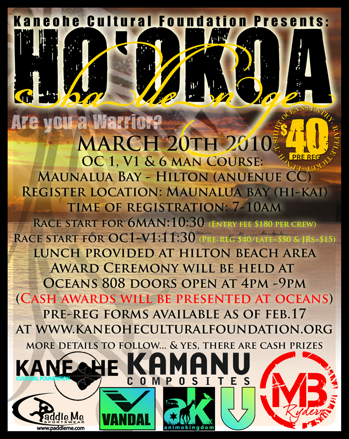 Due to unforeseen logistical circumstances, the “Ho’okoa Challenge and fundraiser at Oceans 808 scheduled for Saturday, March 20, 2010 has been CANCELLED. All those who have completed pre-registration will be reimbursed in full. Please contact Sandra Kalahiki, Vice-President of Kaneohe Cultural Foundation at 808-429-9333 for your refund. On behalf of Kaneohe Cultural Foundation and its members we apologize for any inconveniences this may have caused.