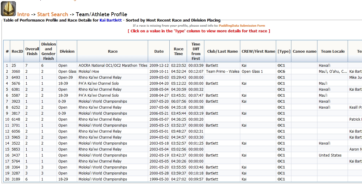 The following is a summary of race profile for Kai Barlett for his OC6 and OC1 solo and OC1 Relay performance