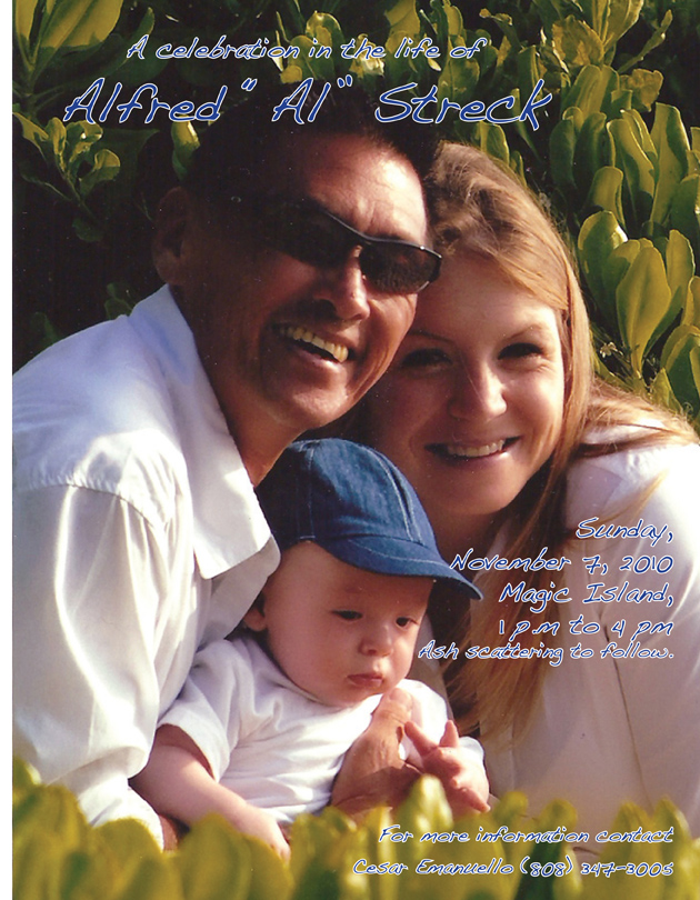 A Celebration in the Life of Alfred "Al" Streck, Sunday, November 7, 2010 At Magic Island 1 P.M. til 4 P.M. For more information Contact Cesar Emanuello (808) 347-3005
