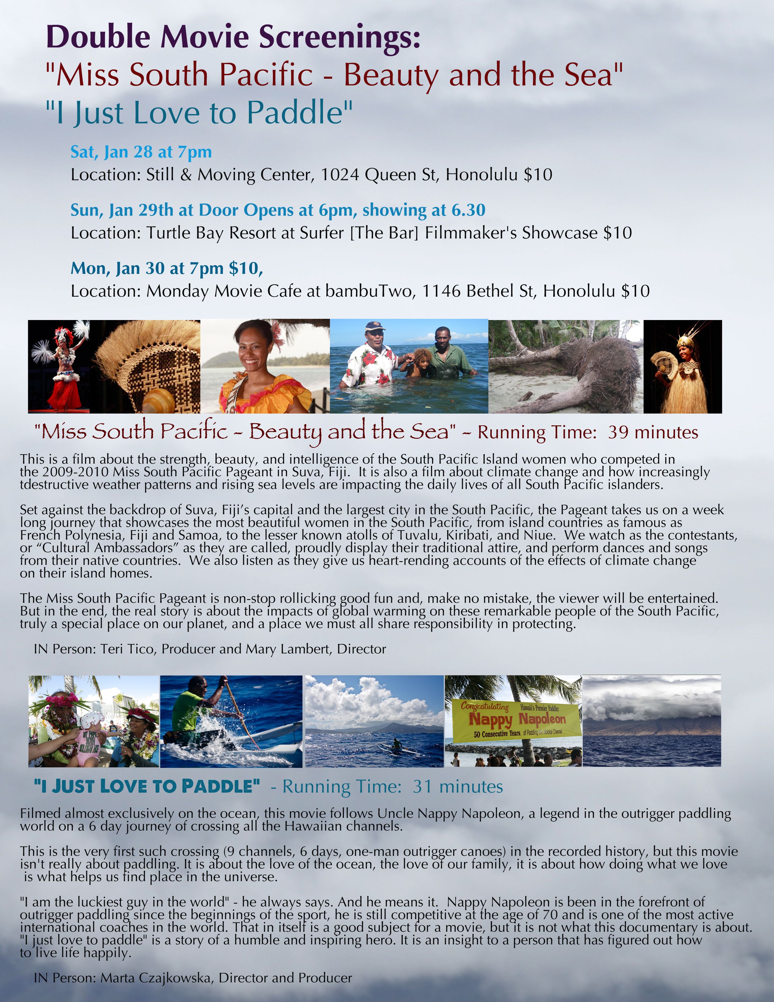 We are happy to invite you to join us at the screeings of two extraordinary films "Miss South Pacific - Beauty and the Sea" and "I Just Love to Paddle".