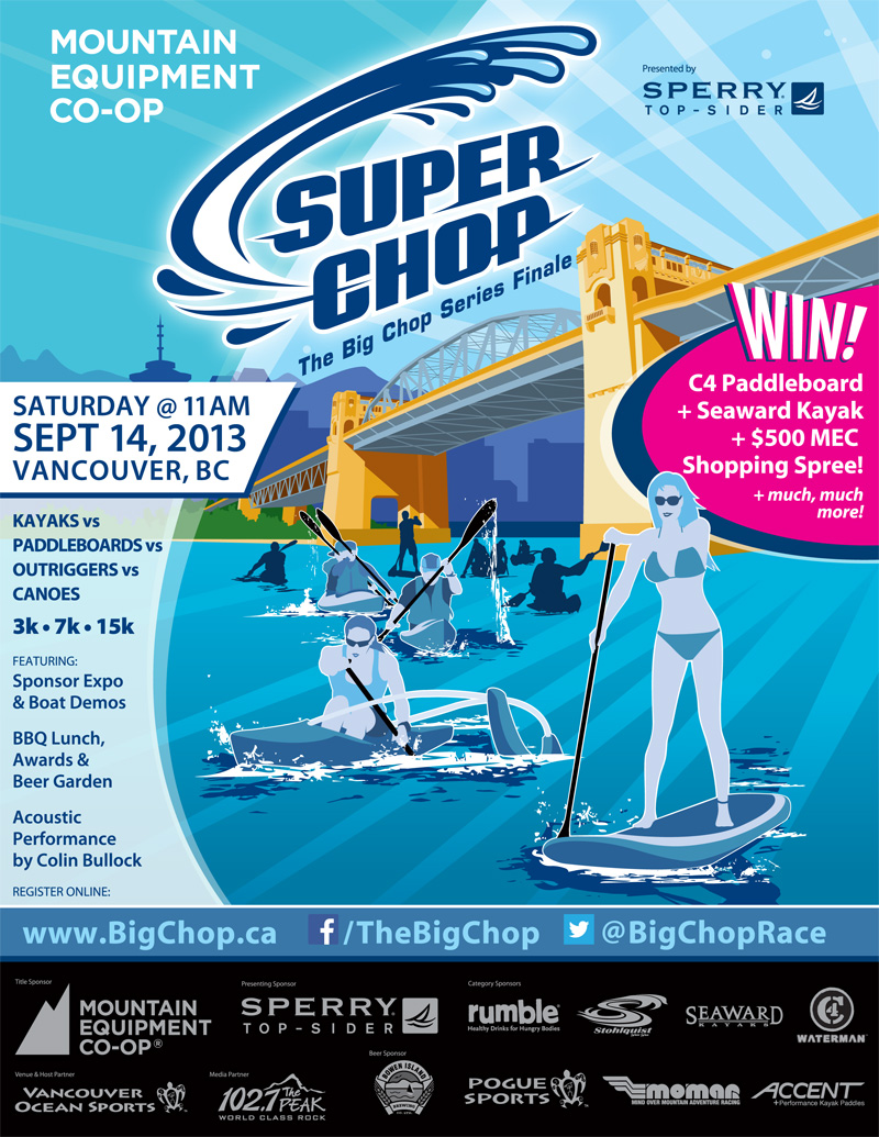 As the host club for the MEC Big Chop Summer Paddle Series, http://www.bigchop.ca/, Vancouver Ocean Sports would like to invite all paddlers to the year-end wrap up race appropriately titled The Super Chop on Saturday, September 14th. This race is open to any small boat and SUP (kayak, surfski, OC1/2, dugout canoe…) pretty much anything that floats that you can paddle. For this race there will be three separate heats, 3km, 7km and 15km. Registration must be done online prior to race date, see the website for the registration process. All paddlers that have received this email will receive a $5 discount by using the promo code, “OC5” (note that registration fees go up on Sept 1st).