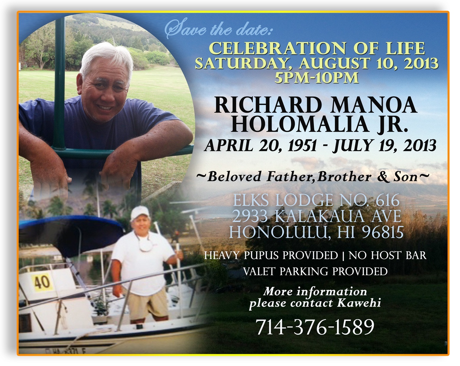 There will be a memorial service for Holo this Saturday at the Elks club from 5pm – 10pm (announcement attached).