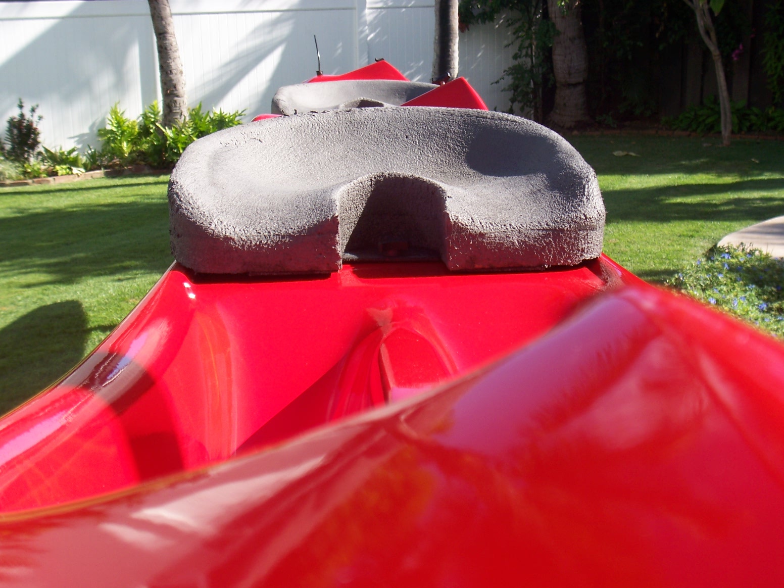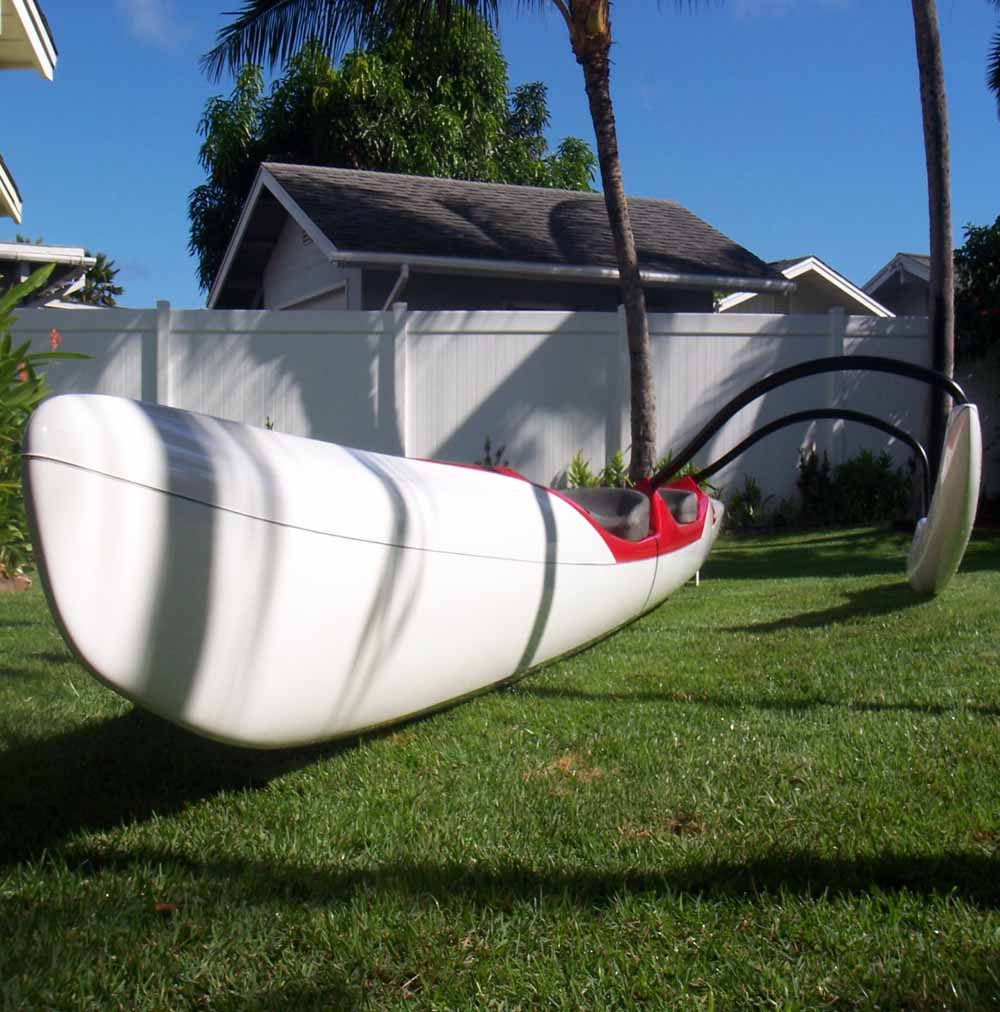 Practically brand new Outrigger Connection OC-2 Stingray. Red with white. Made by Karel Tresnek, either the first or second boat out of a new mold, so has a little more care put in to it. This is the OC-2 with the ama around the rear paddler only, so the rear paddler controls the ama.