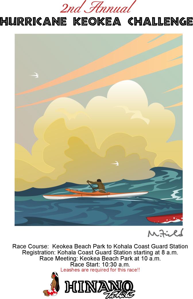 Results of today's 2nd Annual Hurricane Invitational Race. The 11 mile course ran south from Keokea in North Kohala to the old Coast Guard Station, south of Upolu Airport. Moderate swells and gusty winds made for fast times, and all 56 racers finished within 30 minutes of one another, first to last across the line. Six Jetskis kept track of everyone on the open ocean, and all paddlers, including 5 juniors and 8 women, did a great job in safely finishing the sometimes difficult course.