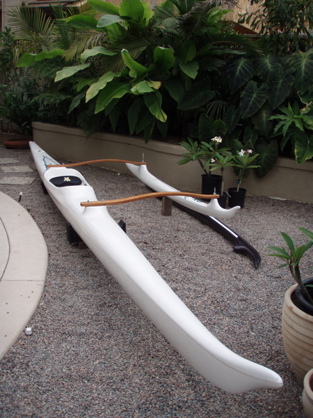 Jeff Alexander built fiberglass OC1 for sale. White hull with white ama and extra purple ama. Two sets of Iako's (one wood, one aluminium). PVC stands for storage. OC1 is based on old C-Lion design.....so not a sit on top. Family emergency forces sale.....must sell ASAP. Paid 1200 for the canoe two years ago, will take 1000 or best reasonable offer. Also have Kialoa all carbon paddle that I will throw in with sale of canoe, but would like at least 1100 for the entire set-up. Canoe located in San Diego (Golden Hills). Please email me for pictures.