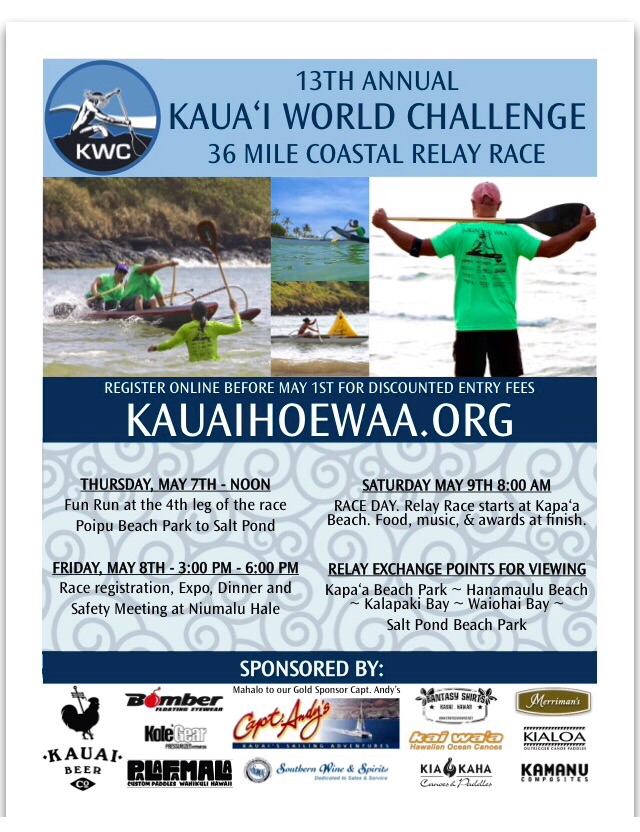 Come an join us on our beautiful Island of Kauai on May 9th for the Kauai World Challenge Relay. We will have a fun run on May 7th Poipu Beach Park to Saltpond. That's the 4th leg of the Kauai World Challenge. After party at the Kauai Beer Company. Registration, packet, pre race dinner , race meeting an expo on May 8th 3pm-6pm at the Niumalu Canoe club hale at Kalapaki beach. For more info you can go to www.kauaihoewaa.org or register online at https://www.webscorer.com/register?raceid=34573